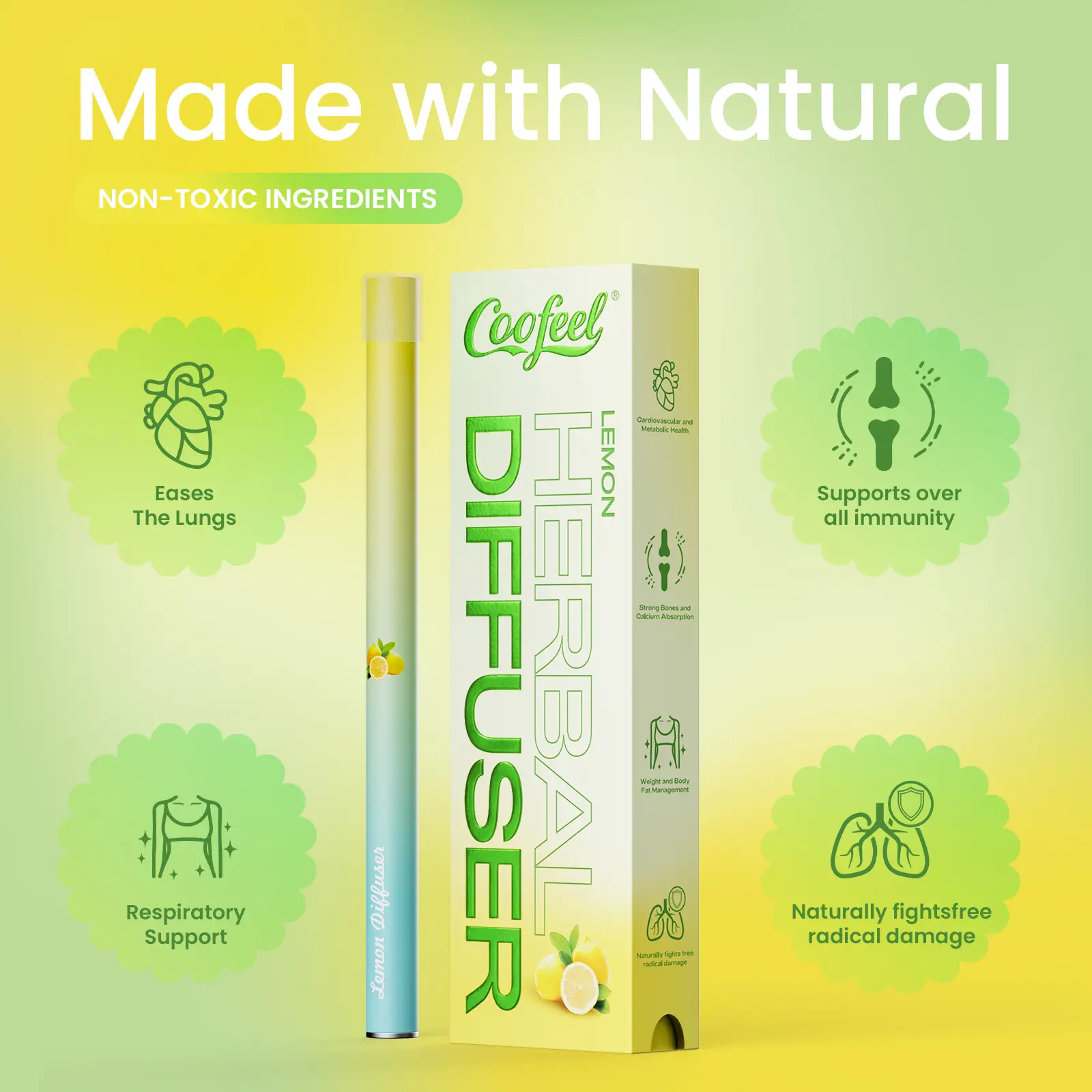 1. 0% nicotine and tobacco-free. This Lemon Herbal Diffuser Pen is made for adults who prefer a bright, citrus-led draw without nicotine.